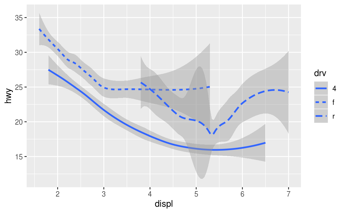 ggplot(data = mpg, mapping = aes(x = displ, y = hwy)) + geom_point() + geom_smooth() ggplot() + geom_point(data = mpg, mapping = aes(x = displ, y = hwy)) + geom_smooth(data = mpg, mapping = aes(x = displ, y = hwy)) -