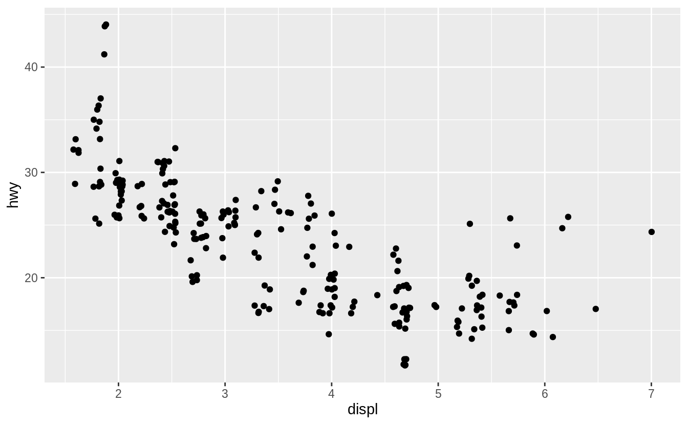 displ, a car’s engine size, in litres.hwy, a car’s fuel efficiency on the highway, in miles per gallon (mpg). A car with a low fuel efficiency consumes more fuel than a car with a high fuel efficiency when they travel the same distance.