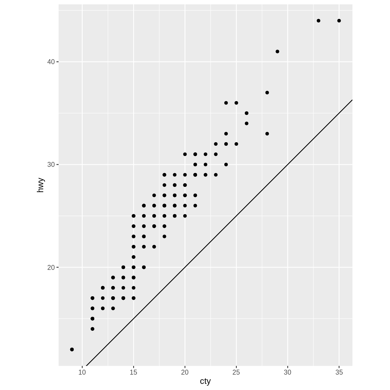 coord_fixed()important? What doesgeom_abline()do?ggplot(data = mpg, mapping = aes(x = cty, y = hwy)) + geom_point() + geom_abline() + coord_fixed()