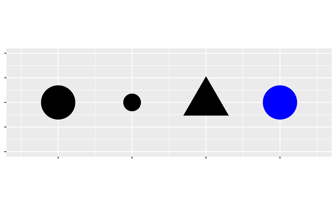 You can add a third variable, like class, to a two dimensional scatterplot by mapping it to an aesthetic. An aesthetic is a visual property of the objects in your plot. Aesthetics include things like the size, the shape, or the color of your points. You can display a point (like the one below) in different ways by changing the values of its aesthetic properties. Since we already use the word “value” to describe data, let’s use the word “level” to describe aesthetic properties. Here we change the levels of a point’s size, shape, and color to make the point small, triangular, or blue: