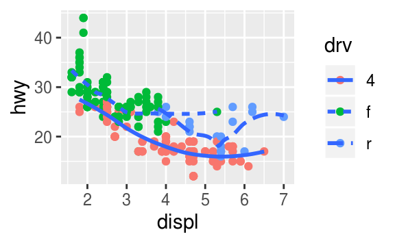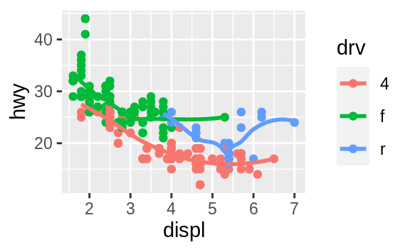 ggplot(data = mpg, mapping = aes(x = displ, y = hwy, color = drv)) + geom_point() + geom_smooth(se = FALSE) What does
