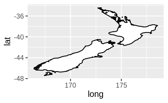coord_quickmap()sets the aspect ratio correctly for maps. This is very important if you’re plotting spatial data with ggplot2 (which unfortunately we don’t have the space to cover in this book).nz <- map_data("nz") ggplot(nz, aes(long, lat, group = group)) + geom_polygon(fill = "white", colour = "black") ggplot(nz, aes(long, lat, group = group)) + geom_polygon(fill = "white", colour = "black") + coord_quickmap()
