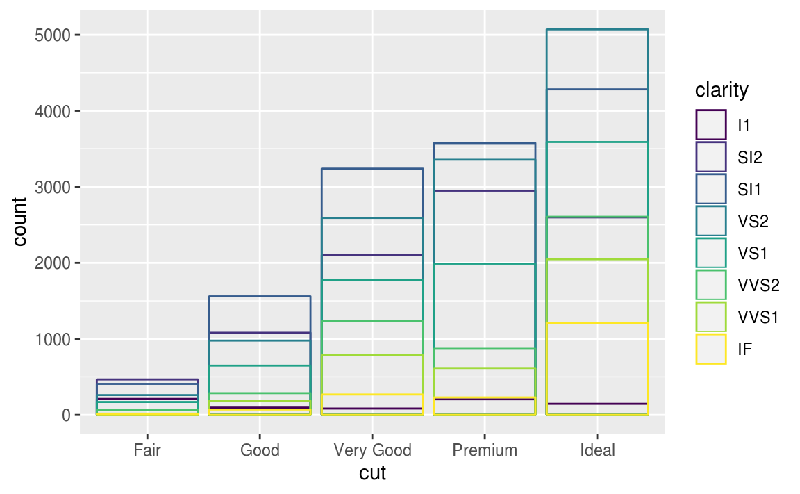 position = "identity"will place each object exactly where it falls in the context of the graph. This is not very useful for bars, because it overlaps them. To see that overlapping we either need to make the bars slightly transparent by settingalphato a small value, or completely transparent by settingfill = NA.ggplot(data = diamonds, mapping = aes(x = cut, fill = clarity)) + geom_bar(alpha = 1/5, position = "identity") ggplot(data = diamonds, mapping = aes(x = cut, colour = clarity)) + geom_bar(fill = NA, position = "identity")