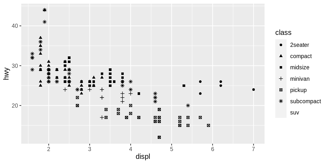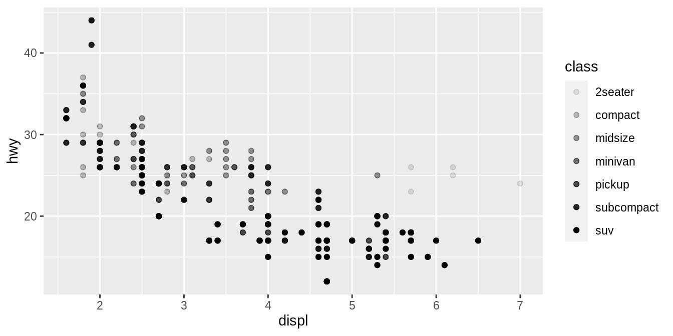 Or we could have mapped class to the alpha aesthetic, which controls the transparency of the points, or to the shape aesthetic, which controls the shape of the points.