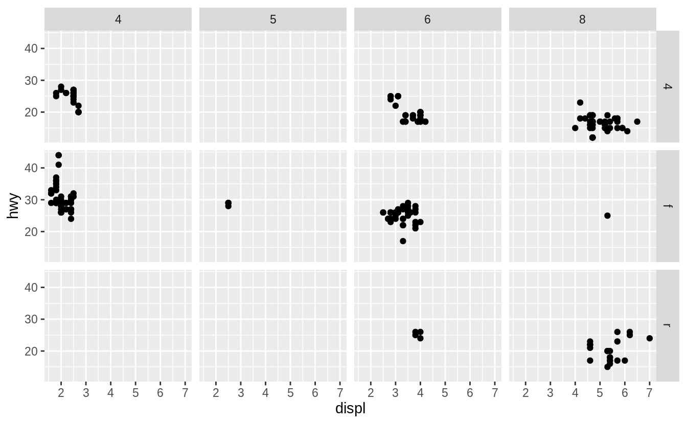 To facet your plot on the combination of two variables, add facet_grid() to your plot call. The first argument of facet_grid() is also a formula. This time the formula should contain two variable names separated by a ~.