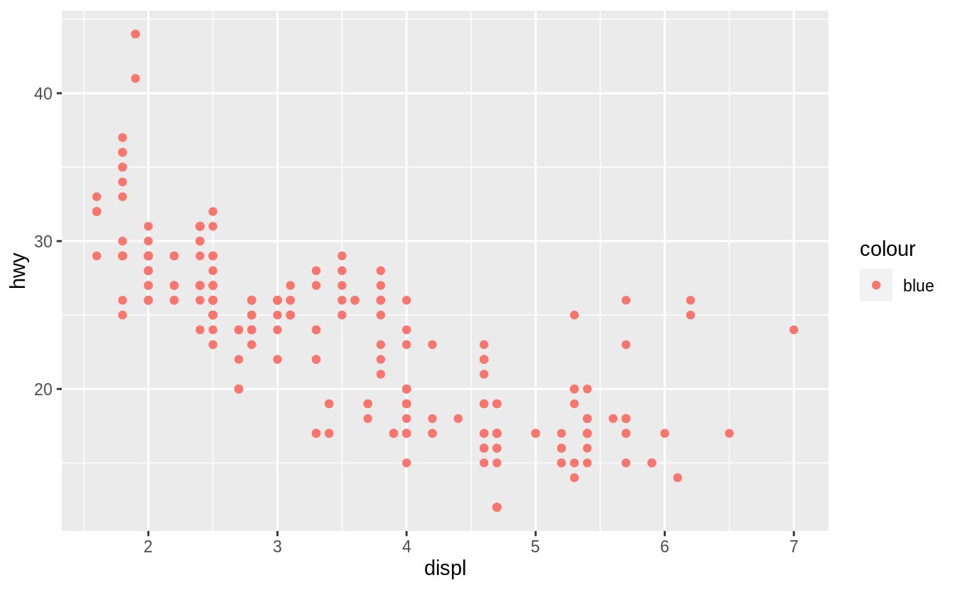 ggplot(data = mpg) + geom_point(mapping = aes(x = displ, y = hwy, color = "blue"))