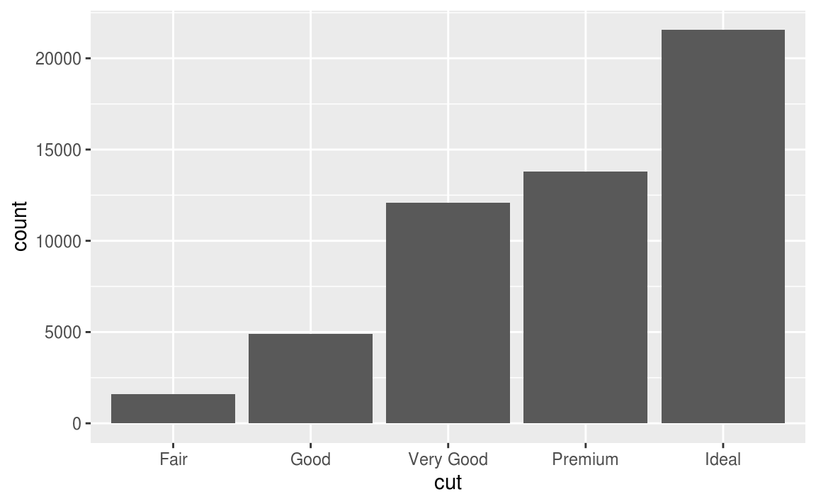 On the x-axis, the chart displays cut, a variable from diamonds. On the y-axis, it displays count, but count is not a variable in diamonds! Where does count come from? Many graphs, like scatterplots, plot the raw values of your dataset. Other graphs, like bar charts, calculate new values to plot: