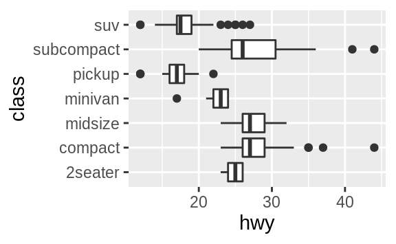 coord_flip()switches the x and y axes. This is useful (for example), if you want horizontal boxplots. It’s also useful for long labels: it’s hard to get them to fit without overlapping on the x-axis.ggplot(data = mpg, mapping = aes(x = class, y = hwy)) + geom_boxplot() ggplot(data = mpg, mapping = aes(x = class, y = hwy)) + geom_boxplot() + coord_flip()
