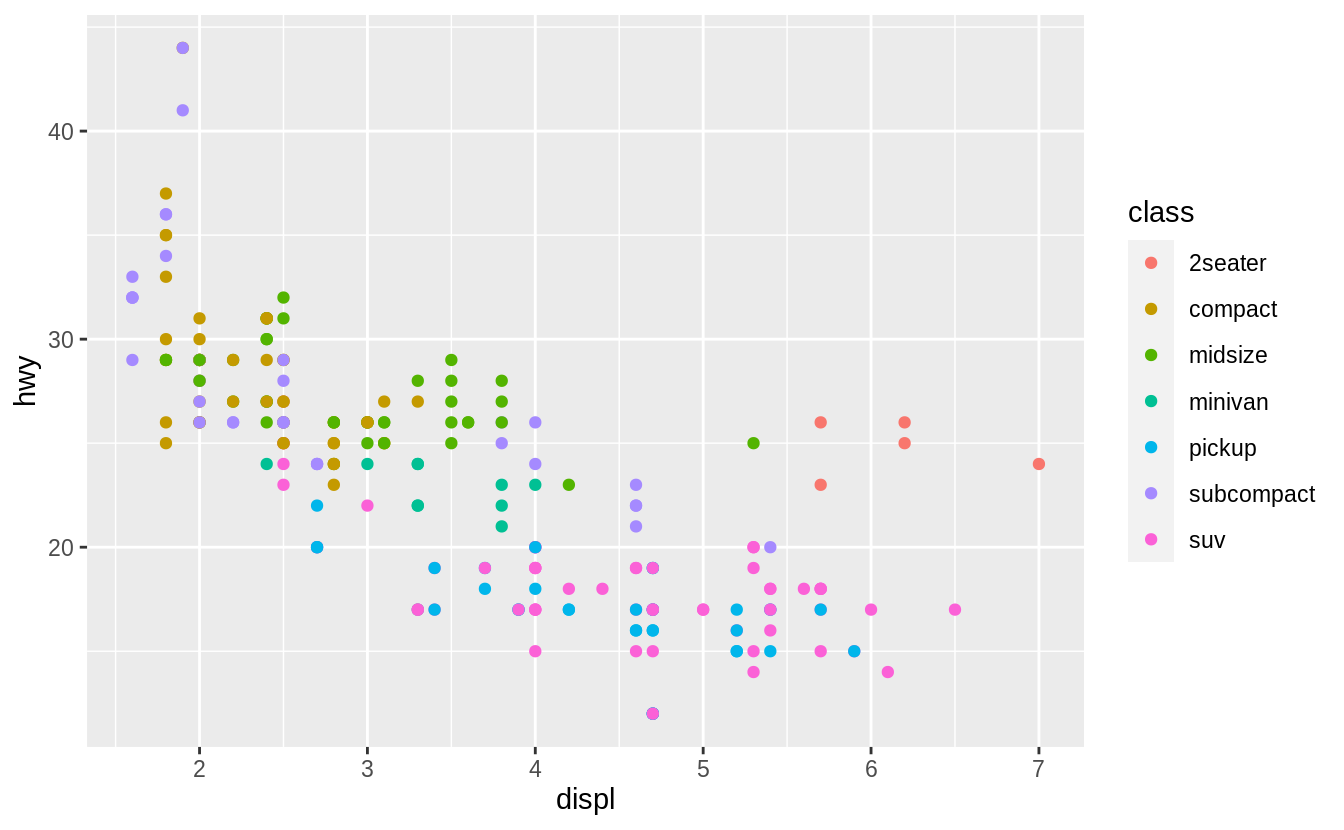 You can convey information about your data by mapping the aesthetics in your plot to the variables in your dataset. For example, you can map the colors of your points to the class variable to reveal the class of each car.