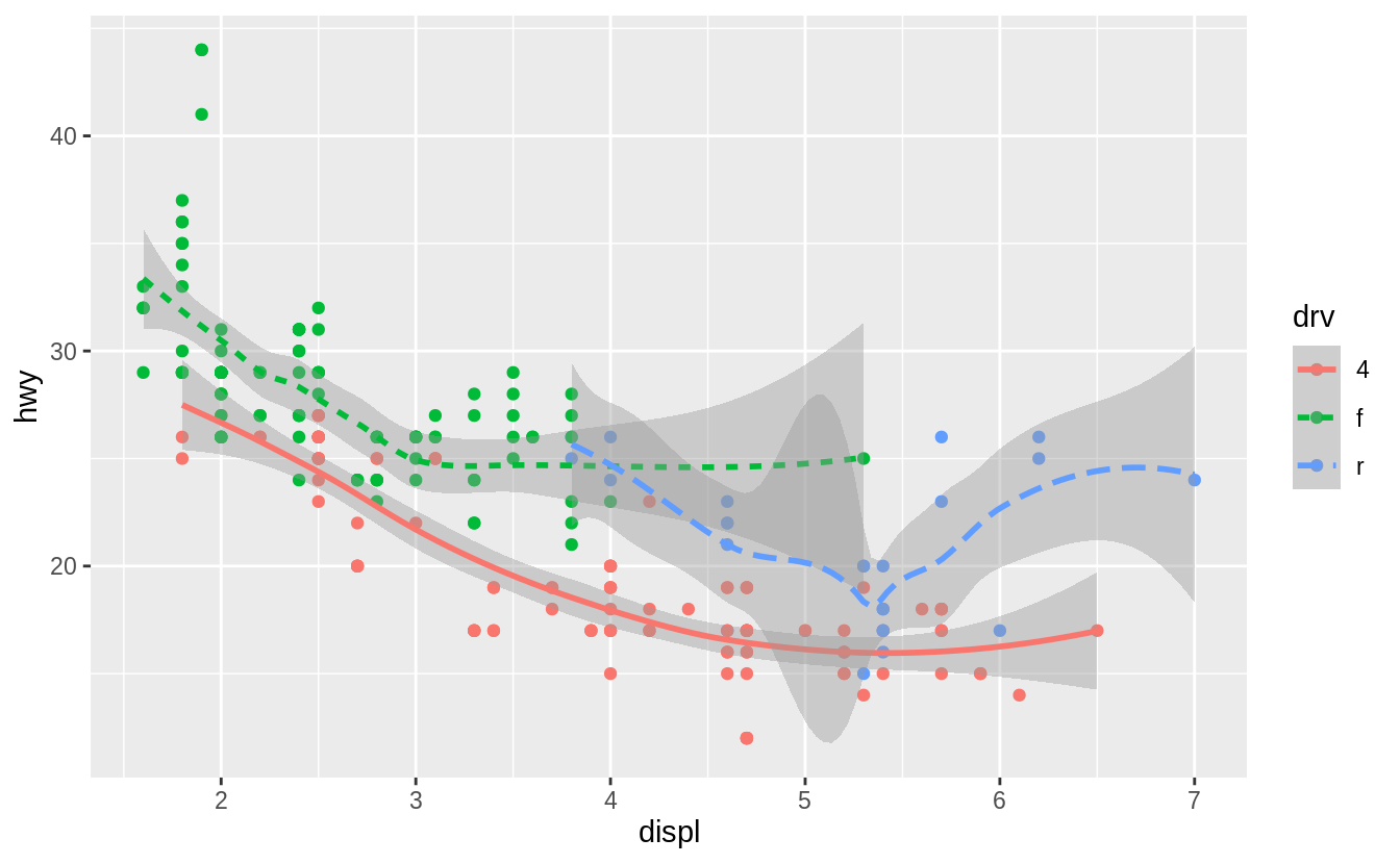 geom_smooth()If you place mappings in a geom function, ggplot2 will treat them as local mappings for the layer. It will use these mappings to extend or overwrite the global mappings for that layer only. This makes it possible to display different aesthetics in different layers.
