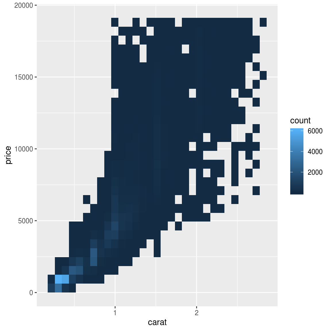 geom_bin2d(mapping = aes(x = carat, y = price))