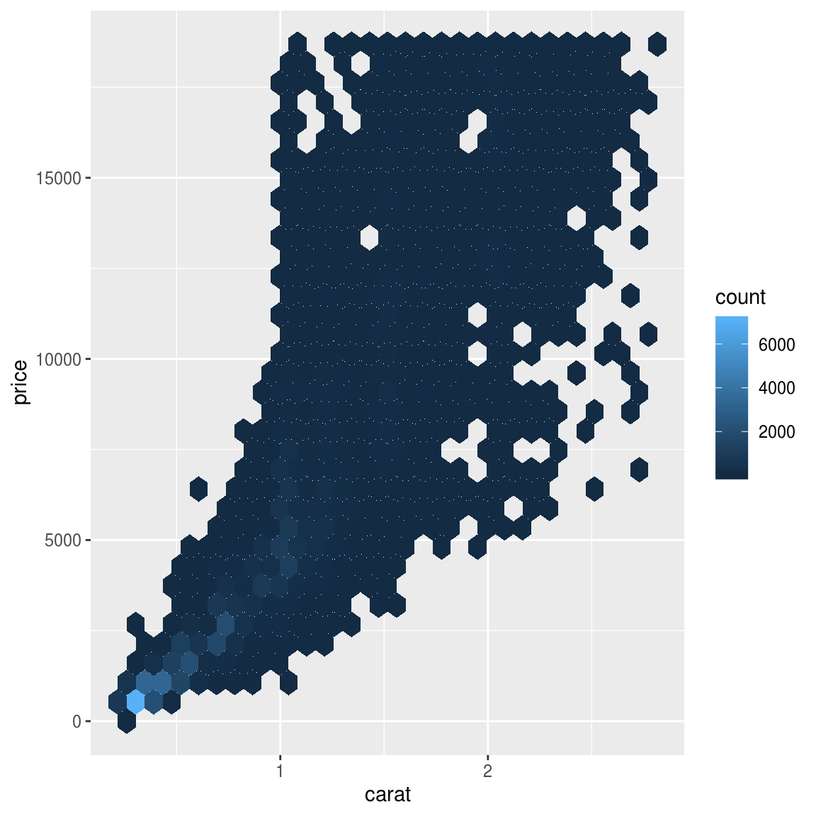 geom_hex(mapping = aes(x = carat, y = price))