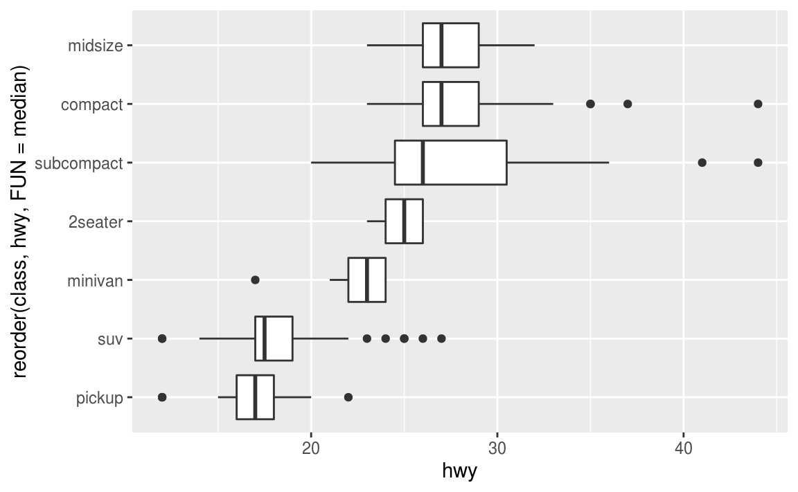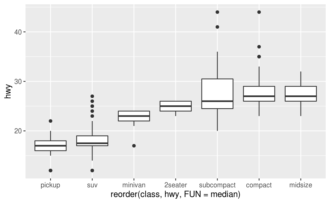 geom_boxplot(mapping = aes(x = reorder(class, hwy, FUN = median), y = hwy)) +