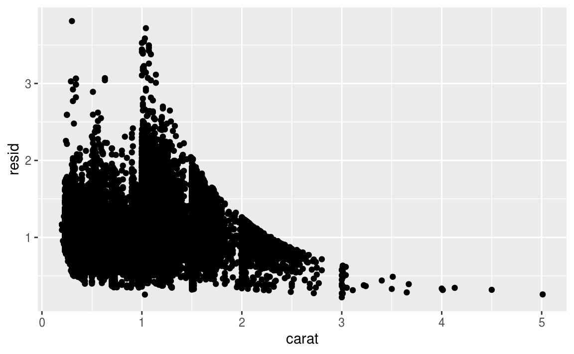 Models are a tool for extracting patterns out of data. For example, consider the diamonds data. It’s hard to understand the relationship between cut and price, because cut and carat, and carat and price are tightly related. It’s possible to use a model to remove the very strong relationship between price and carat so we can explore the subtleties that remain. The following code fits a model that predicts price from carat and then computes the residuals (the difference between the predicted value and the actual value). The residuals give us a view of the price of the diamond, once the effect of carat has been removed.