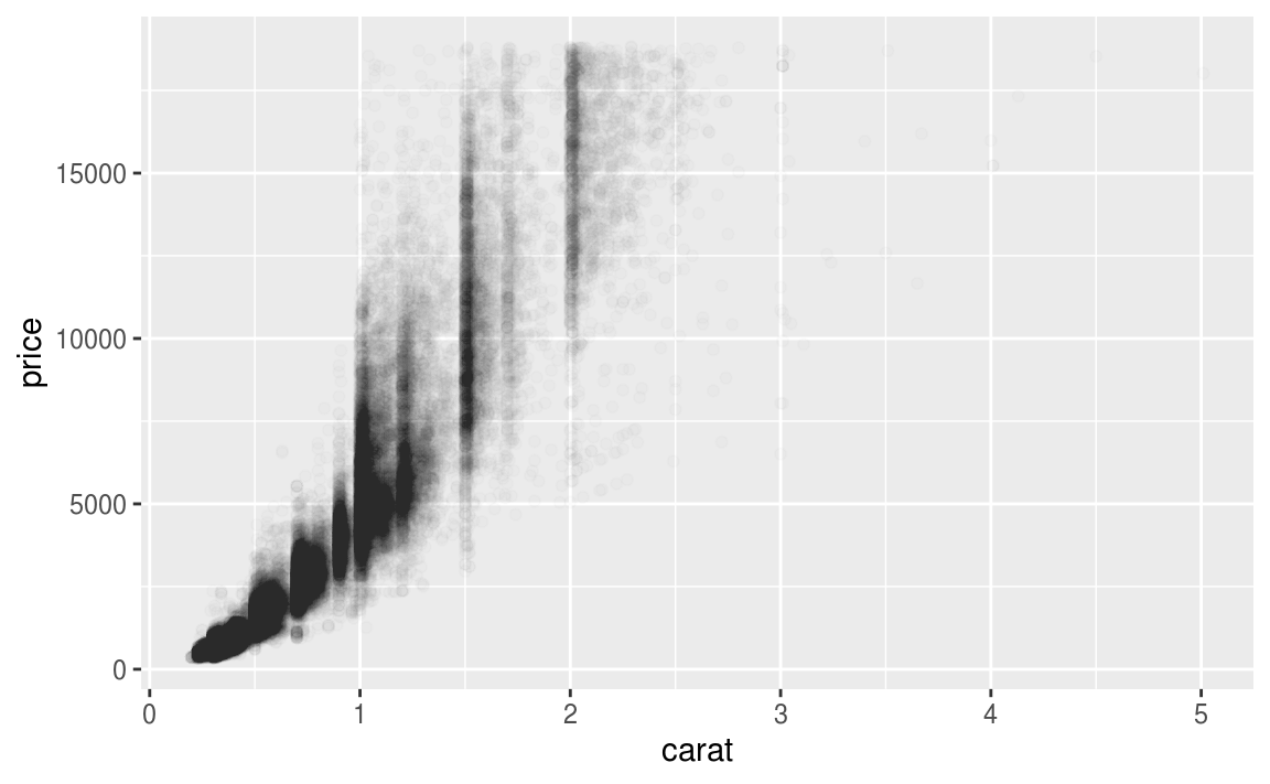 geom_point(mapping = aes(x = carat, y = price), alpha = 1 / 100)