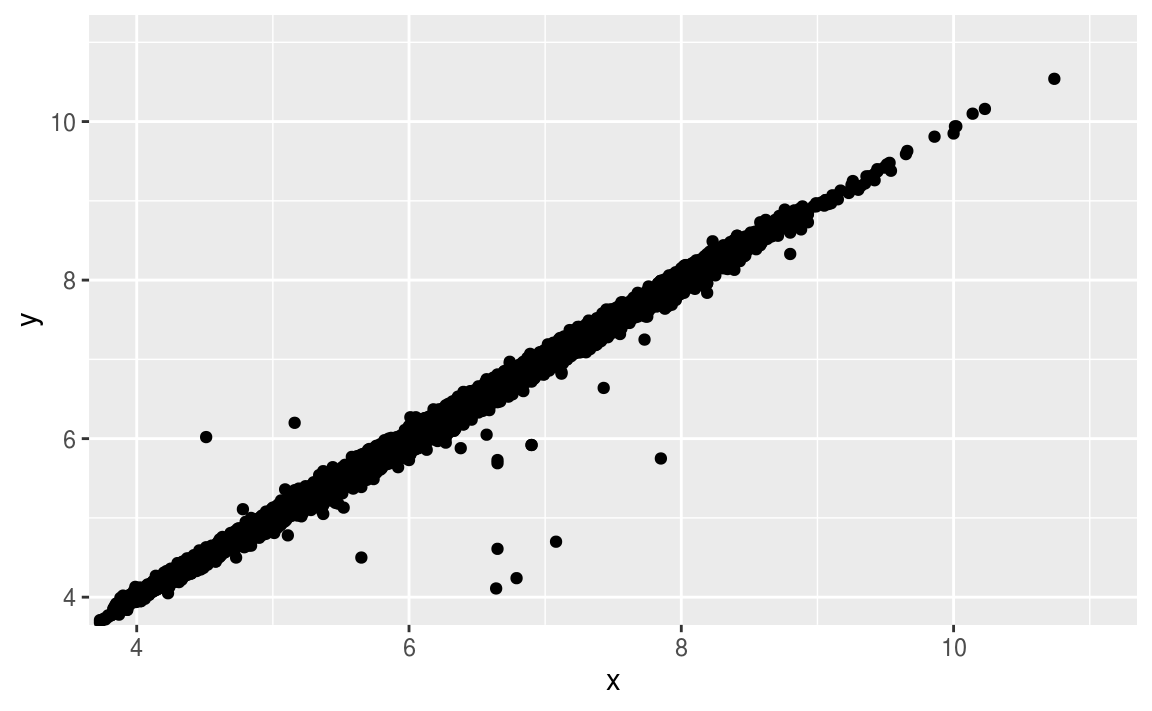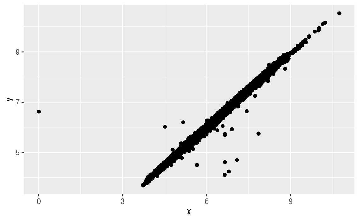 xandyvalues, which makes the points outliers even though theirxandyvalues appear normal when examined separately.ggplot(data = diamonds) + geom_point(mapping = aes(x = x, y = y)) + coord_cartesian(xlim = c(4, 11), ylim = c(4, 11))