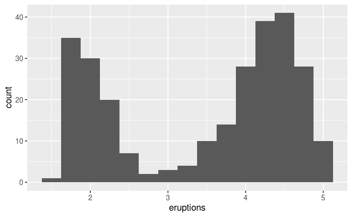 ggplot(data = faithful, mapping = aes(x = eruptions)) +