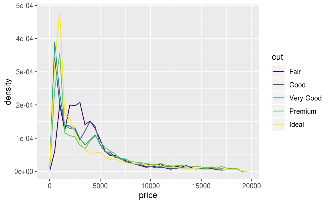 geom_lv()to display the distribution of price vs cut. What do you learn? How do you interpret the plots?Compare and contrast