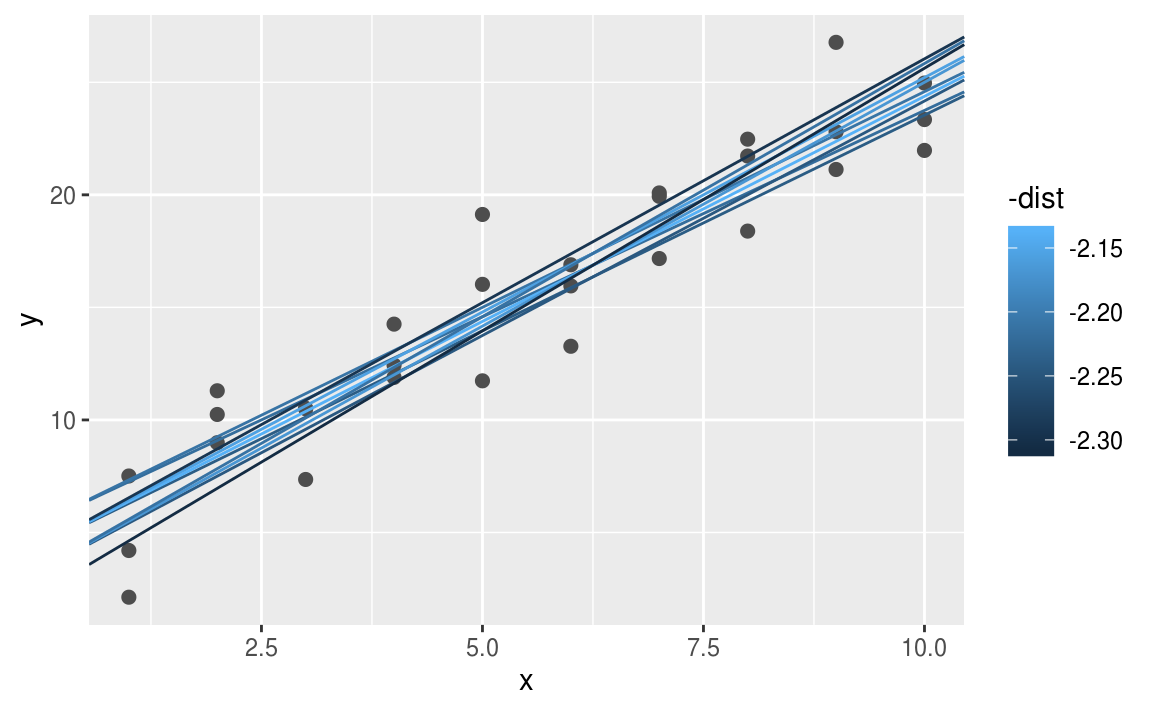 #> # … with 244 more rowsNext, let’s overlay the 10 best models on to the data. I’ve coloured the models by -dist: this is an easy way to make sure that the best models (i.e. the ones with the smallest distance) get the brighest colours.