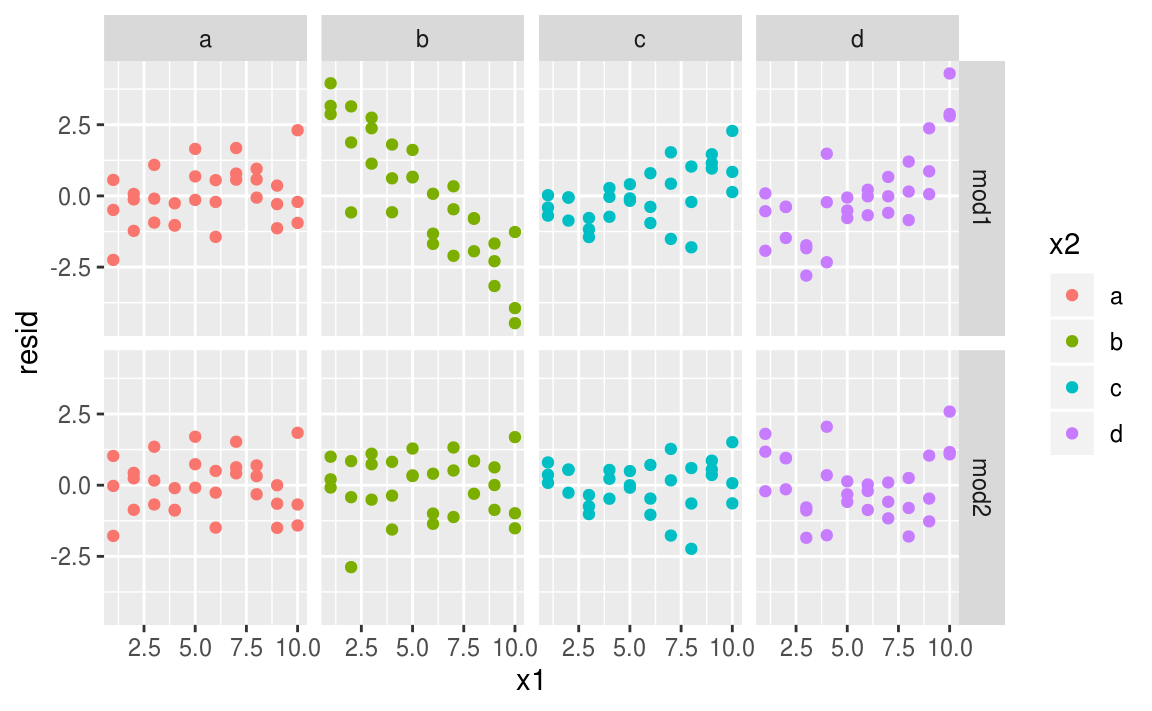 I spent some time looking at the residuals to see if I could figure if mod2 did better than mod1. I think it does, but it’s pretty subtle. You’ll have a chance to work on it in the exercises.