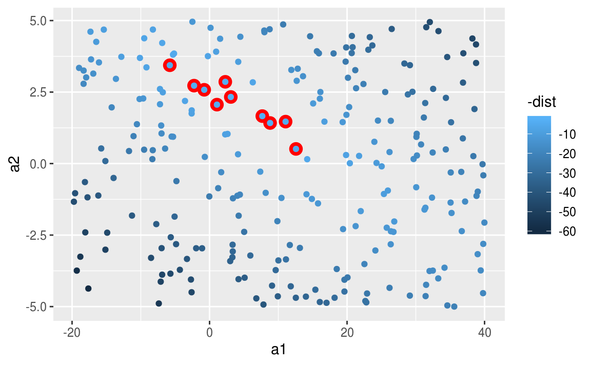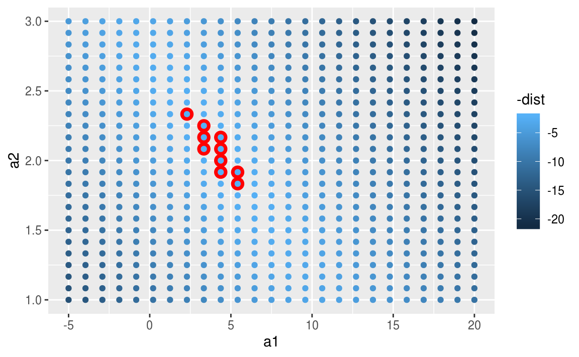 We can also think about these models as observations, and visualising with a scatterplot of a1 vs a2, again coloured by -dist. We can no longer directly see how the model compares to the data, but we can see many models at once. Again, I’ve highlighted the 10 best models, this time by drawing red circles underneath them.