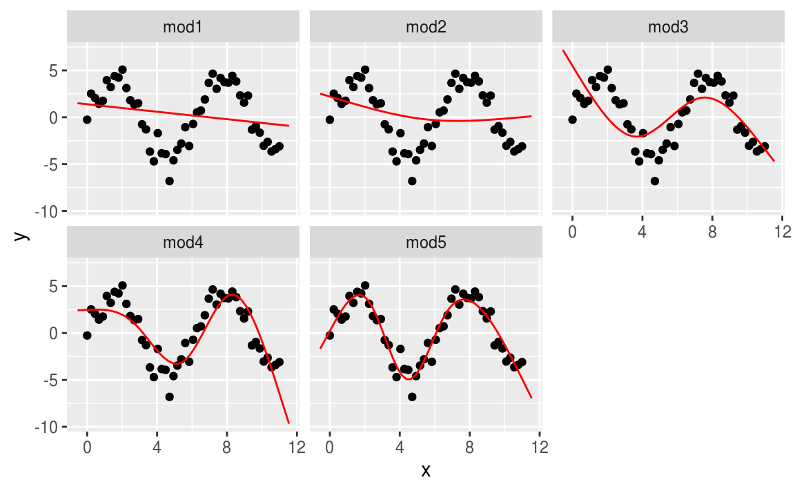 gather_predictions(mod1, mod2, mod3, mod4, mod5, .pred = "y")